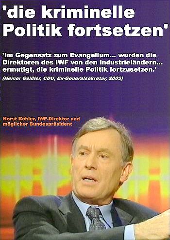 "Sie sind weder Fisch noch Fleisch. Sie sind Getriebener,...Wo Mut angesagt wäre, sind Sie ein Papiertiger. ...16 Millionen Menschen in den neuen Bundesländern haben dabei déjà vu Erlebnisse." - Ein freundlicher Brief an den Herrn Bundeskanzler Von J Scholz "Der Leiter des Presseclubs für ausländische Journalisten, Steven Adolf, teilte mit, bei Korrespondenten seien Anrufe aus dem Büro von Ministerpräsident José María Aznar eingegangen" - und worüber beschwert sich die Journaille? Darüber, daß die "Informationen" in Windeseile -zu schnell- einen Dreck wert waren. Nicht aber, daß sie "Hintergrundinformationen" auf diese Weise erhielten. Denn das ist das Normale: gebrieft zu werden. Auch beschwert man sich nicht darüber, daß die derzeitigen "Fahndungsergebnisse" ebenso windig sind wie die vorigen. Herr Zapatero möchte gerne die Beziehungen zu Deutschland und Frankreich verbessern. Schön. Und zugleich seine Truppen aus dem Irak abziehen (den "Club der Selbstmörder" verlassen) - zur selben Zeit, in der sich Schrökel gerade räuspert, mit "der NATO" nun doch in den Irak zu ziehen. Was denkt sich der junge Heißblutspanier eigentlich? Ent- oder weder ! Der "Spiegel" rückt ZACK schon die Schlagzeilen zurecht: Chaos wird ausbrechen, Zapatero läßt die kühnsten Träume der Terroristen wahr werden usw. Sagt es doch klipp und klar: Truppenabzug ist Terror und Chaos, Zapatero spaltet Europa, Krieg ist Frieden, Bundeswehr und NATO sind Friedensbewegung, und die Friedensbewegung gehört dringend nach Guantanamo. Nieder mit dem Wahlvolk. Sagt es doch frei raus ..., ! Da will einer Bundespräsident werden, der beim IWF z.B. zeigte, wie Wirtschaften auf argentisch geht, und auch schon, wie gemerkelte "Überparteilichkeit" aussieht: ![]() Danke an http://www.arbeiterfotografie.com/sozialraub #e September Eleventh Families For Peaceful Tomorrows #e cia.gov/cia/english_rewards.htm Helft der CIA! Wissen Sie, wo sich eine Massen- vernichtungswaffe befindet - rufen Sie mal an ... #e Movie: Ellen Mariani sagt, was Sache ist #e Movie: 9-11 Demos #e Ellen Mariani: Bush wußte Bescheid und ließ den 11.9. geschehen #e "The White House said it did not feel public testimony would be needed." # High noon: der Rächer der Enterbten lehrt die Bosse das Fürchten - nachdem er schon zweidrei Gelegenheiten verpaßt hatte, wählt er nun die Waffe der gesellschaftlichen Debatte. Der Laden, dem er vorsteht, scheint dafür nicht geeignet zu sein? # eine saubere Karriere - seit 09/2003 bei Daimler- Chrysler Washington im Planungsstab - wann wird er wohl Chefredakteur? # "Korruption sei ... vor allem auf der politischen Ebene weit verbreitet, das Justizwesen funktioniere schlecht und sei abhängig von Weisungen aus dem Justizministerium, die Polizei agiere häufig willkürlich und gewalttätig" - nein, nicht was Sie denken. In Rumänien ist das so. #e "You either say you didn't have warning prior to 9/11 and you let us see the documents, or you shouldn't claim that," # Schläfer schlaffen beim "Spiegel" - und transportieren Berlusconis Rassismus gegen Nordafrikaner # Wenn wir eine Nato haben, die nicht mehr strategische Herausforderungen der Zukunft debattiert, dann können wir sie eigentlich auch zumachen. # Glos im dlf: "wir werden die Regierung treiben." So ist es - eine Schrökel- Regierung.Und Franz ("die Peitsche") erklärt der Basis die CDU/CSU-Politik, an der diese sich selbst die Finger nicht schmutzig macht # steigt der Ölpreis, steigen auch die Reserven # Alterspyramide keine unumstößliche Grundlage der Agenda 2010 #e wie man viele Jubeliraker produziert #e Condis Tee-Einladung ("so candid"- aber keine Details) # ein Schuß - acht Verletzte. erstaunliche Bilanz auf der "Friedenskonferenz"jetzt noch zwei Mal in die Luft, und die Helden laufen nach Hause ... # "Süddeutsche" rechtsradika? - zitiert populistischen Unsinn eines Innensenators, der seinen Job in wenigen Tagen schon nicht mehr haben wird # Warum die rotzgrüne Regierung so dringend eine irakische Regierung braucht #e Einladung zum Tee bei Condy #e