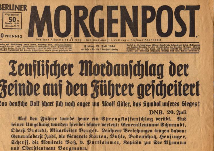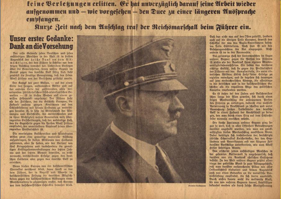 Wie in den heute laufenden TV-Dokus gezeigt, war es den nazis wichtig, sofort zu reagieren - und die Frage des Überlebens Hitlers war hochwichtig für den Ausgang - so oder so. Man beachte neben dieser Konsequenz des Führerprinzips (von Putsch wird in der obersten Schlagzeile nicht gesprochen, sondern nur die Person und ihr Überleben angesprochen) den Aspekt des "Teuflischen" der "Feinde". Denn wer diese waren, war so recht noch nicht klar. Feinde im Innern, Feinde im Ausland - ist das nicht eh dasselbe ? Diese Funktion erfüllen heute die "islamistischen terroristen" . Und da das Göttliche gepachtet war (Gott mit uns stand auf jedem Koppelschloß der Uniformen), waren die Feinde eben "teuflisch" . Alles eine Glaubensfrage - wie mit dem 11.September: Seth-Satan-Saddam, Osama gehören zur Schwefelfraktion und halten sich bekanntlich in Höhlen auf . Das Göttliche hatte in der LTI (lingua tertii imperii, vgl. Klemperer) einen eigenen schicken Begriff: die "Vorsehung". Wenn dieses Wort demnächst in Schäubles Reden auftauchen sollte, ist es an der Zeit, die Köpfe einzuziehen. Noch spielt in Sachen Terror das Wort "Zufall" die große Rolle. Was man durchaus plastischer ausdrücken könnte. Wir halten es z.B. für eine Fügung des Schicksals, daß in den Kofferbomben die libanesische Speisestärke nicht explodierte. Und das Hartweizenmehl nicht am 21.7.05 in London. Aus dem MAI-Archiv: