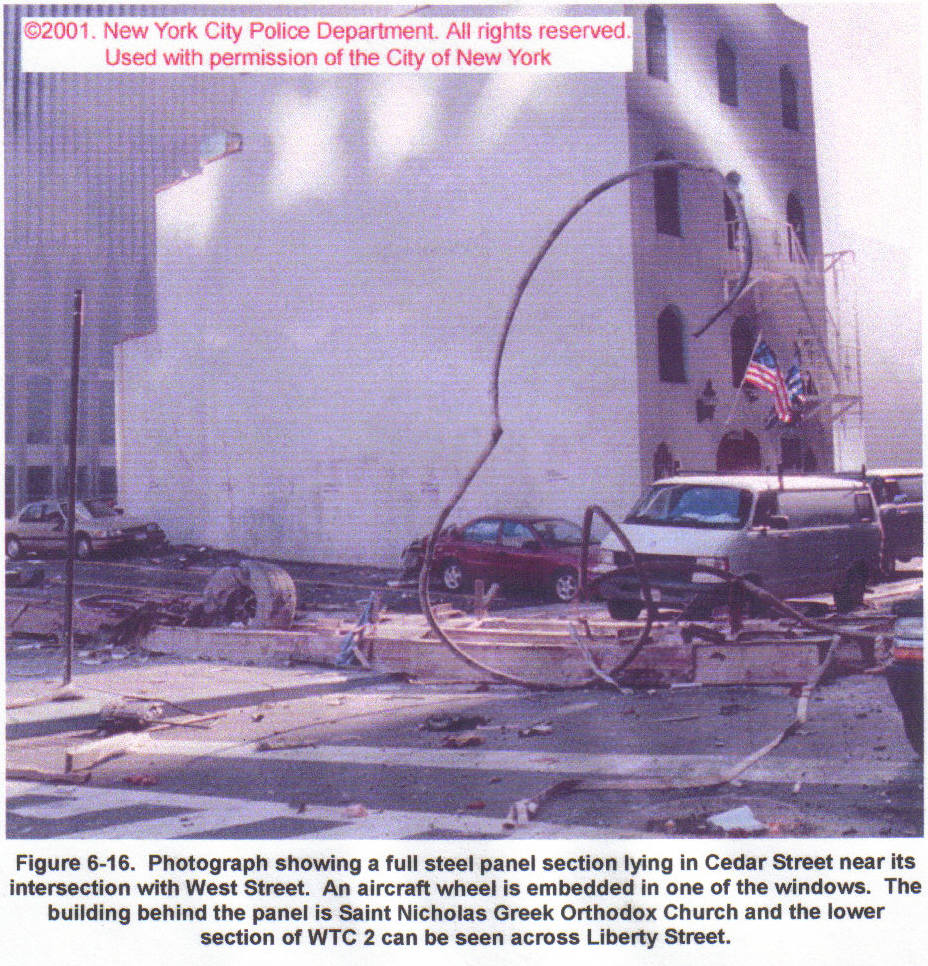 UA175 (Teile eines Triebwerks ohne Verkleidung in den Strassen von Manhattan): ![]() Fahrwerkteil an der Ecke West- und Rector-Street: