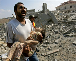Auch der Hisbollah ist es unsäglich peinlich, daß ihre Katjuschas immer wieder in israelischen Orten einschlagen und Zivilisten ins Himmelreich schicken, wo sich ja schon die Kollegen Selbstmordattentäter mit ihren Jungfrauen tummeln. Aus falsch verstandenem arabischen Stolz entschuldigen sie sich nicht einmal dafür. Ich wiederhole: alle beteilgten Täter, vom Regierungschef bis zum einfachen Soldaten oder Hisbollah-Kämpfer, gehören vor Gericht und in den Knast. Diese Perspektive erschreckt das Pack nur deshalb nicht, weil z.B. Schröder, Fischer und Scharping ebenfalls noch frei herumlaufen. Hätten wir bei uns den Dreck gekehrt, wäre unsere Position sauberer. Aber es gibt ja Linke, die nichts vom Recht halten, die mit Schröder am liebsten koaliert hätten und Fischer für einen beliebten linken Ehrenmann halten. Spruch des Tages: "Es gibt zurzeit keine Nation, die sich Israel gegenüber freundschaftlicher verhält als Deutschland." Sollten wir nicht noch einige U-Boote oder Eurofighter schicken ? Endlich jemand, der uns liebt. Die üblichen Propagandabildchen- mal so, mal so: