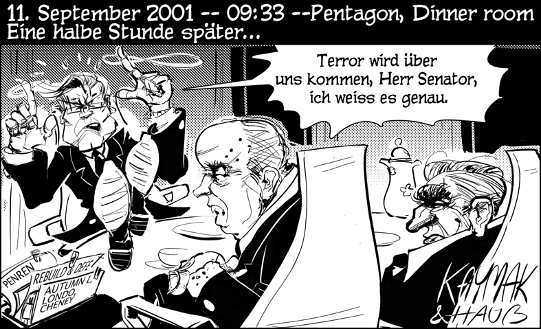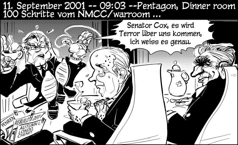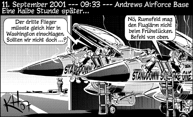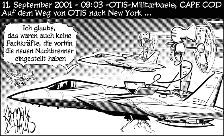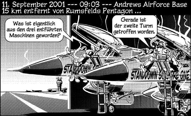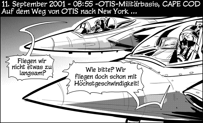 Erst zwei Tage nach dem 11.9. fiel der Bush-Regierung auf, es sei besser, doch etwas über einen Versuch des Abfangens sagen zu können. Und so wurde der Alarmstart zweier Abfangjäger erfunden, die allersings weder beim Start beobachtet wurden noch bei ihrer Ankunft in New York. Sie seien irgendwie zwar mit Höchstgeschwindigkeit gestartet, aber ...